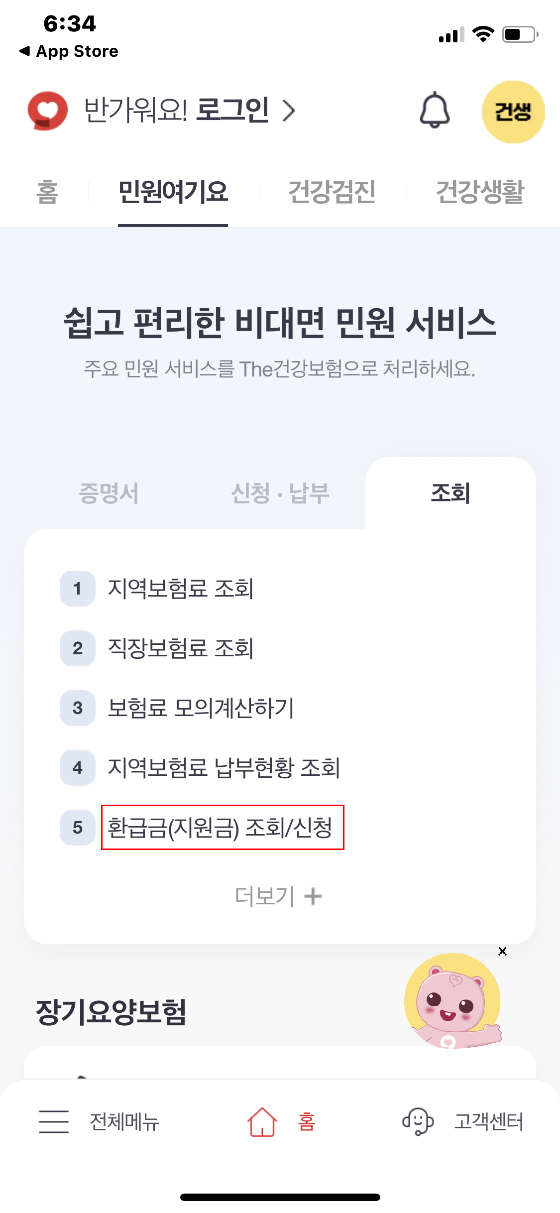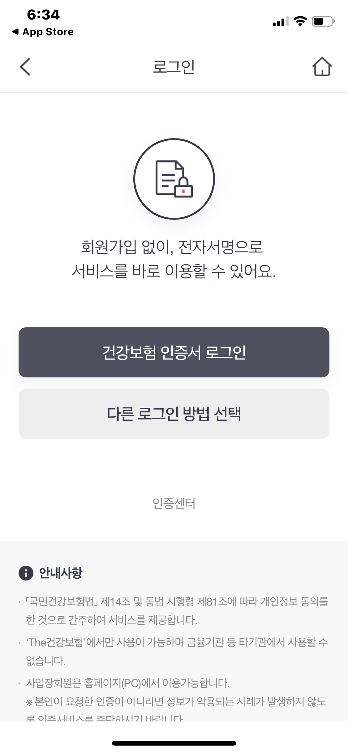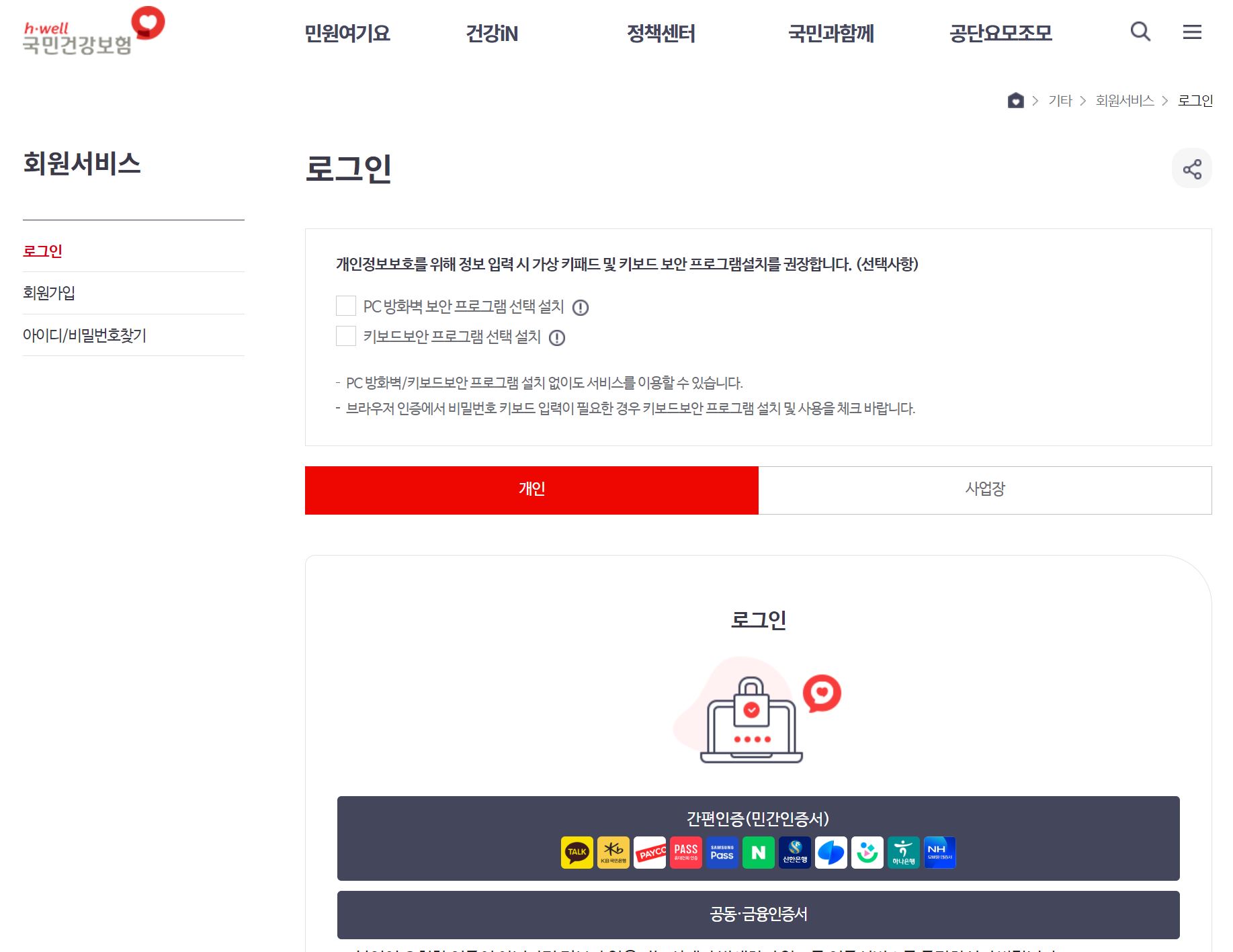 2) 건강보험 인증서 로그인 또는 다른 로그인 방법으로 로그인합니다.