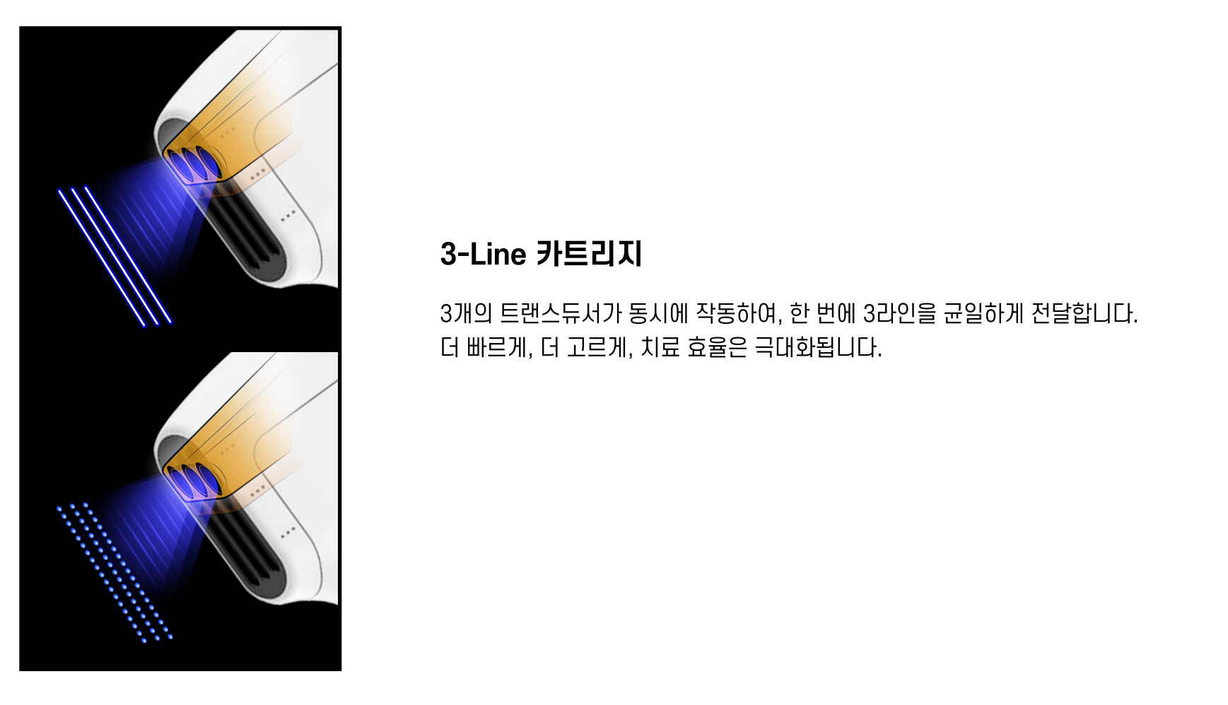 텐트리플이 혁신적인 이유는 바로 '멀티 라인(Multi-Line)' 기술 때문입니다. 기존 장비들이 한 번에 한 줄(1-Line)씩 에너지를 조사했다면, 텐트리플은 세계 최초로 3줄(3-Line)이 동시에 조사되는 기술을 구현했습니다.