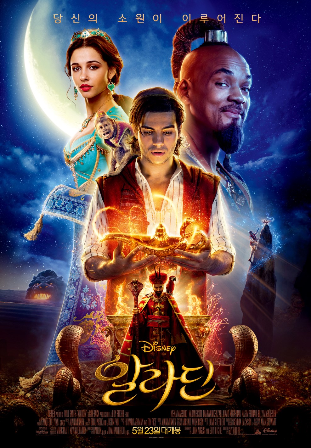 주연 배우로는 메나 마수드(알라딘), 나오미 스콧(자스민 공주), 윌 스미스(지니)가 등장하며,