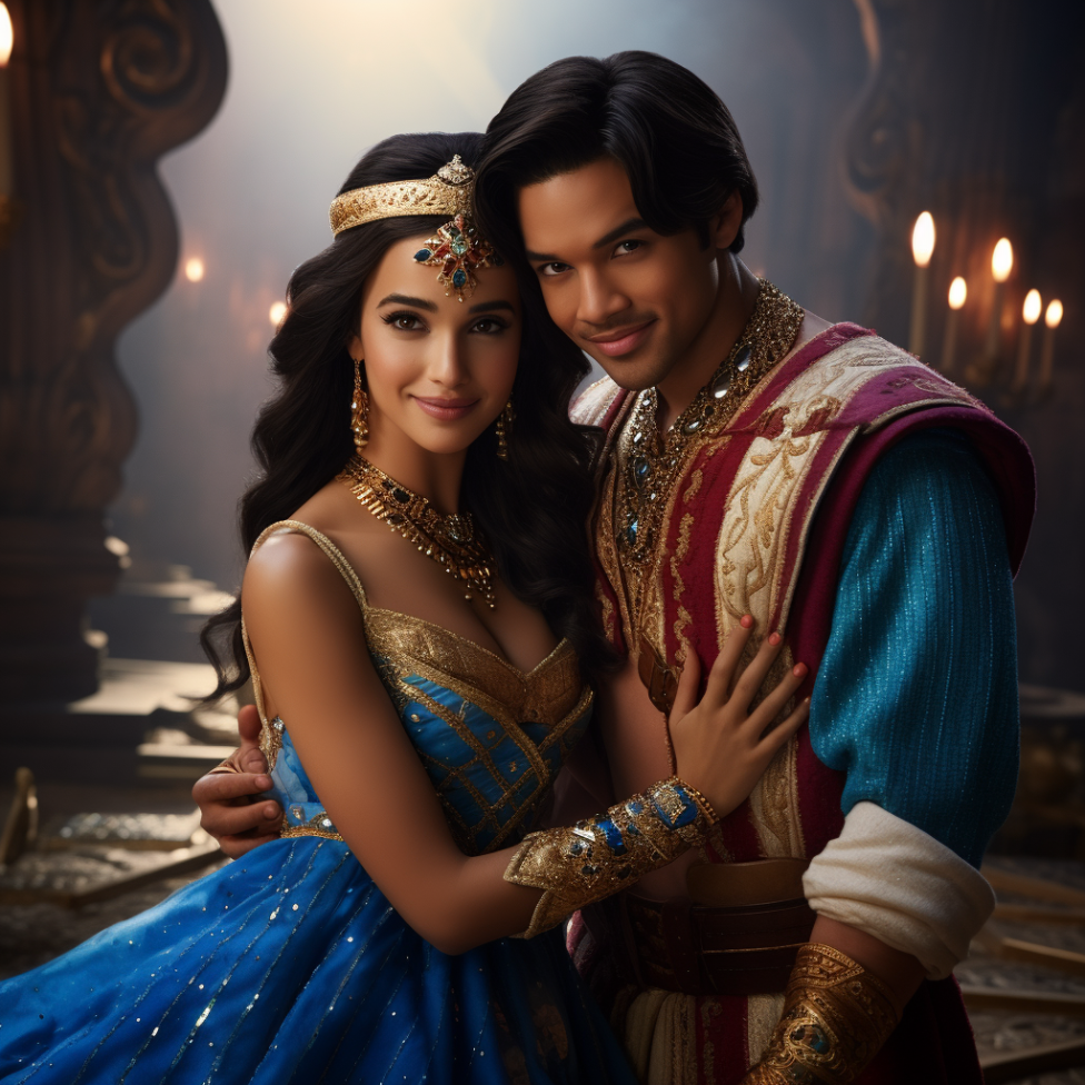 알라딘이 처음에는 왕자로 변신하여 자스민 공주에게 접근하지만, 결국 진심 어린 마음으로 사랑한다는 것이