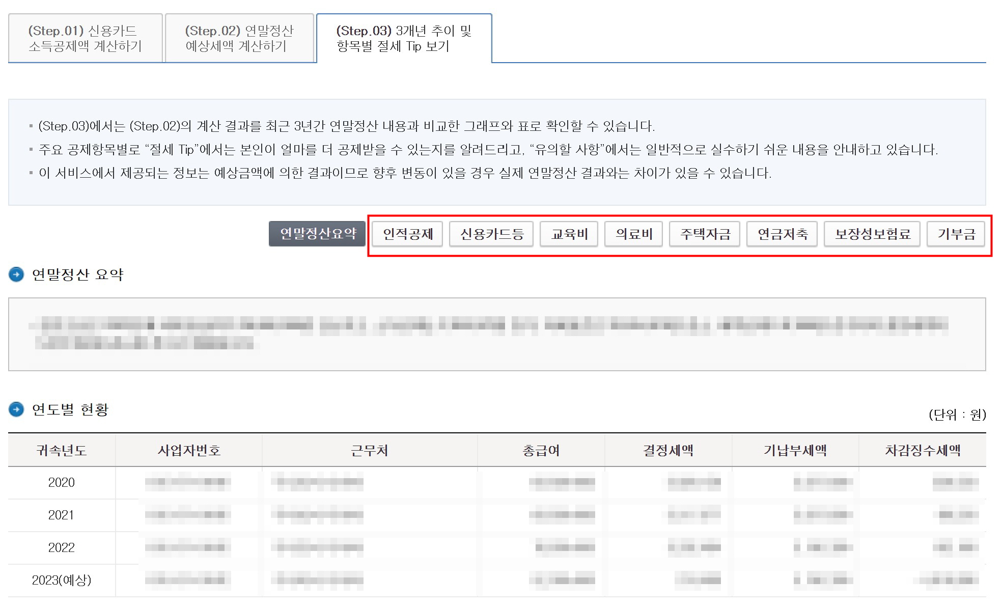 마지막 3단계인 3개년 추이 및 항목별 절세 Tip 보기 탭을 확인하시면