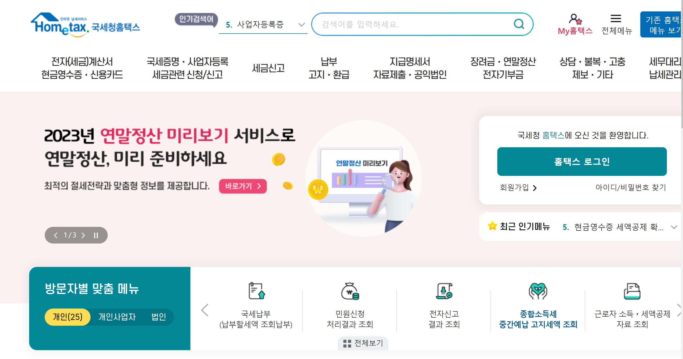 홈택스 로그인해서 메인 화면 정면에 있는 연말정산 미리보기로 들어 갑니다.