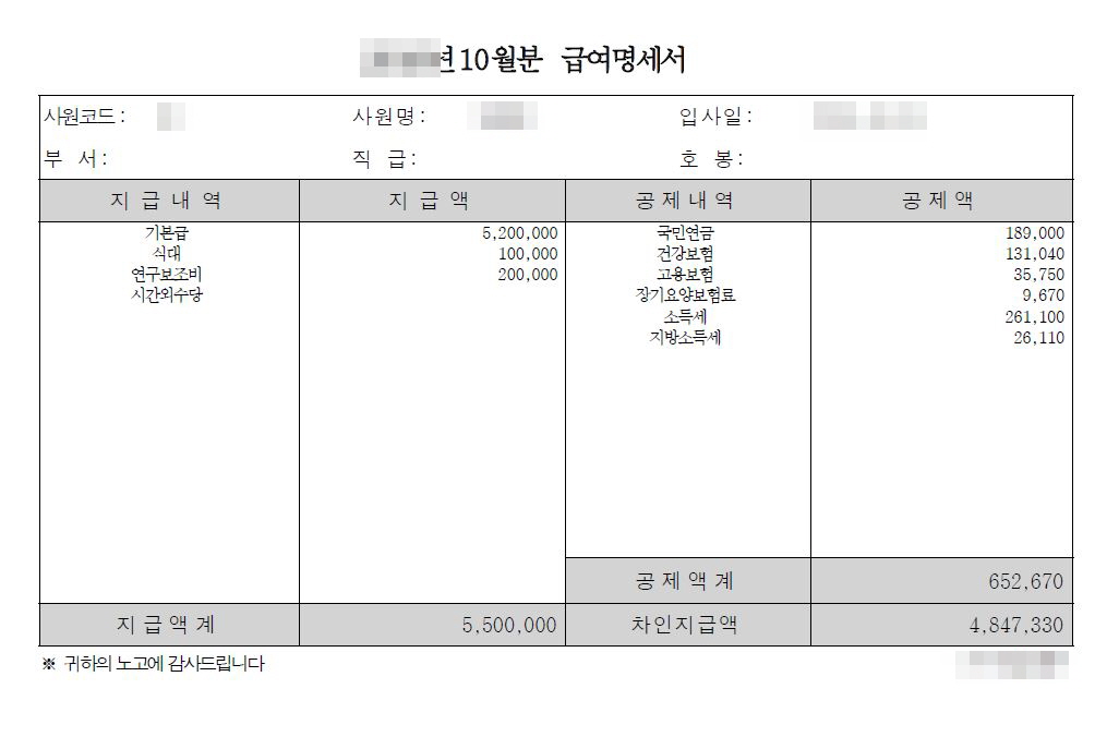 말하고 공제 내역은 4대보험료, 근로소득세, 지방소득세 등을 말합니다.