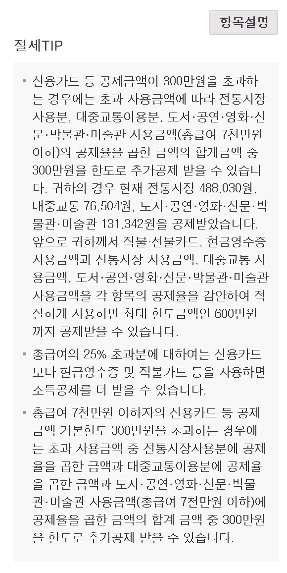 저는 신용카드 공제 300만원 받고, 추가 공제(전통시장, 대중교통, 도서·공연 등)